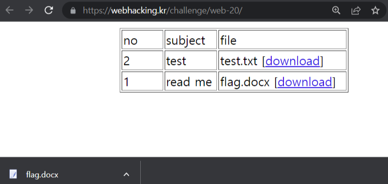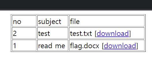 text.txt의 하이퍼링크 부분에는?down=dGVzdC50eHQ= 링크로 이동하게 되어있으며, flag.docx는 그냥 접근이 허용되지 않는다는 메시지만 출력하게끔 되어있다.