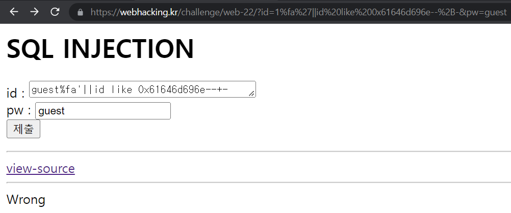 또한 id와 pw 둘 다 admin, select, limit, pw, <, >, = dmf 대소문자를 구분하지 않고 필터링하고 있다.