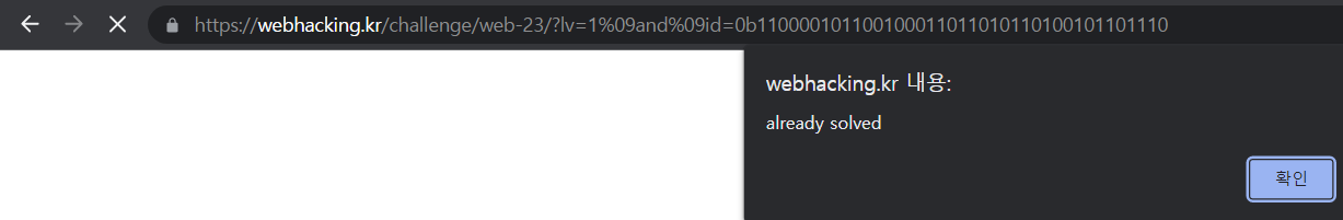 쿼리 2 : 1%09and%09id=0b110000101100100011011010110100101101110