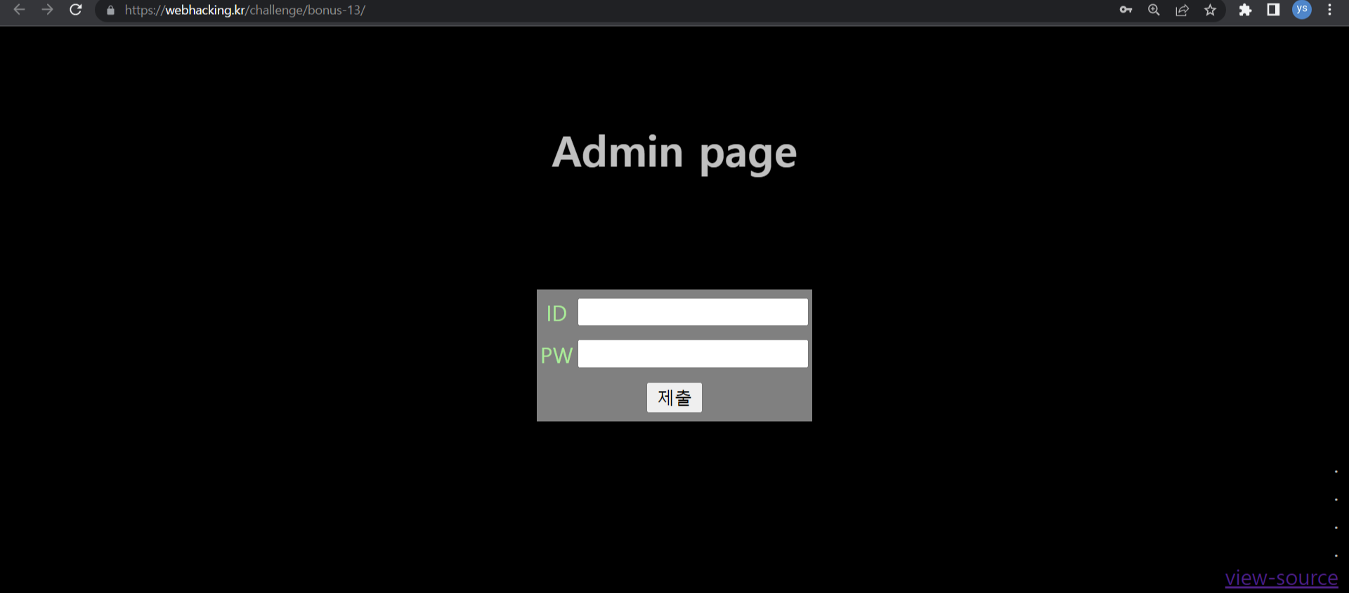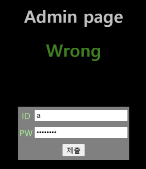 문제 화면 - Admin page 를 출력하며, ID와 PW를 입력할 수 있는 폼이 출력된다. - 소스코드를 확인해보도록 하자 ! 소스코드 - id 값에 대하여 addslashes 함수를 적용하고 있으며, - pw의 경우는 md5 함수가