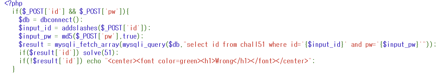 쿼리 : select id from chall51 where id='{$input_id}' and pw='{$input_pw}'를