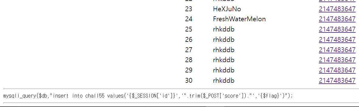 데이터 삽입 쿼리인데 마지막 칼럼에 flag값이 들어가 있다.