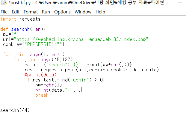 우리는 인젝터를 사용하여 admin의 blind sql injection과 비슷하게 불러와야 한다.
