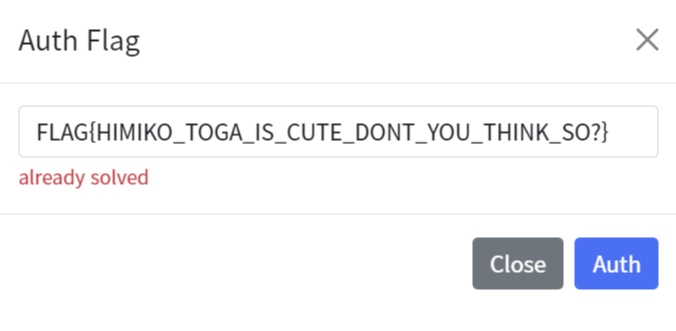 수정 flag : FLAG{HIMIKO_TOGA_IS_CUTE_DONT_YOU_THINK_SO?}