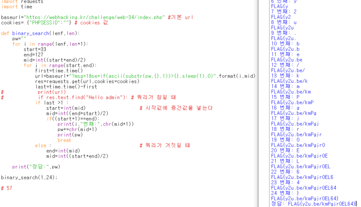 1. time based 공격을 할 땐, sleep() 함수 외에, 웹 서버 부하에 따른 시간 지연, 불안정한 인터넷 연결 등으로 시간 지연이 생길 수 있어, 대기 시간을 길게 할수록 정확도가 올라가나, 시간이 오래 걸린다.