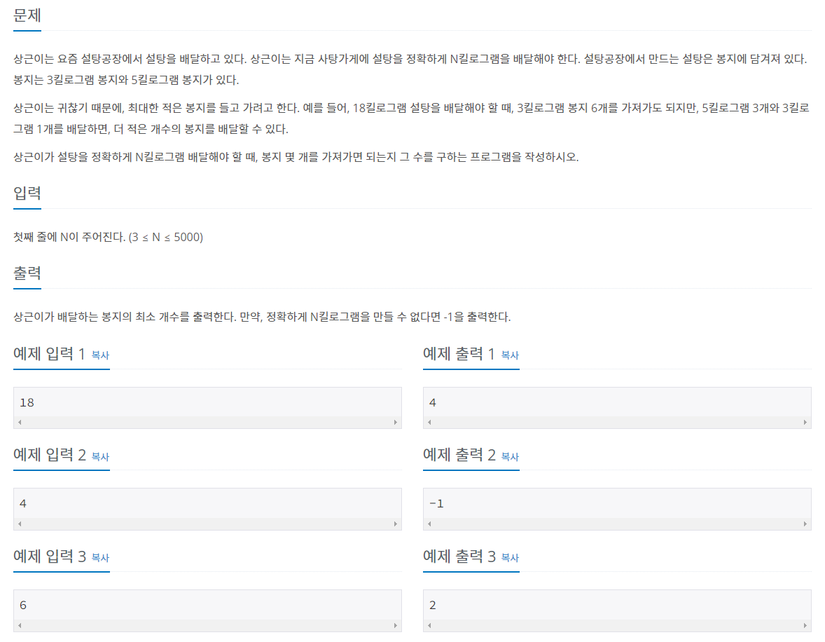 간단하게 5로 나누고 나뉘지 않으면 3kg 한 봉지 담는 가정으로 푼 문제이다.