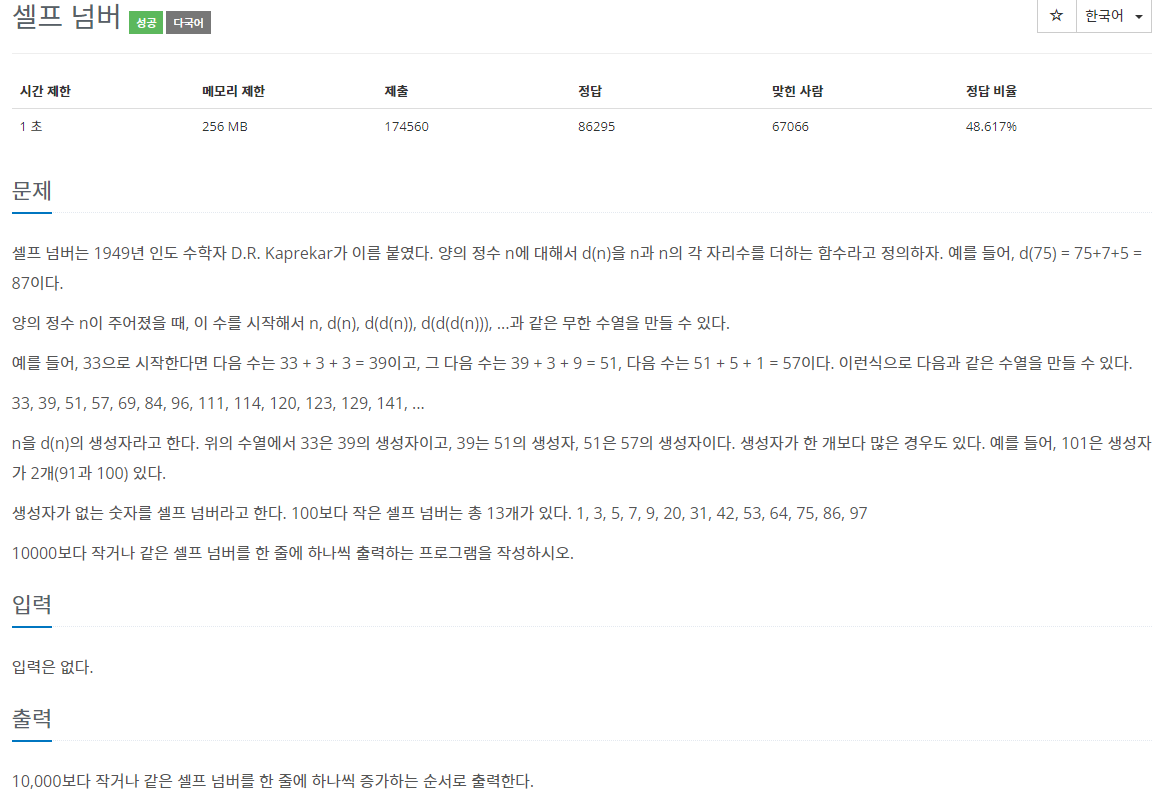 셀프 넘버 성공출처다국어분류 시간 제한 메모리 제한 제출 정답 맞은 사람 정답 비율 1 초 256 MB 56038 28453 22966 50.972% https://www.acmicpc.net/problem/4673 4673번: 셀프 넘버 셀프 넘버는 1949년 인도 수학자