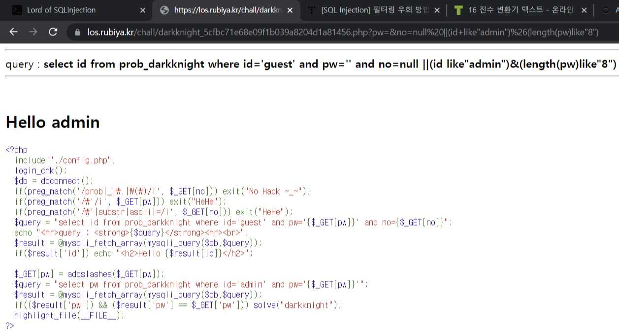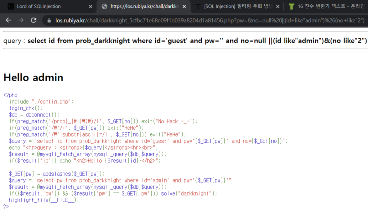 입력받은 pw 값은 ', ", null을 필터링하는 모습이고 그 값이 admin과 같으면 해결된다.
