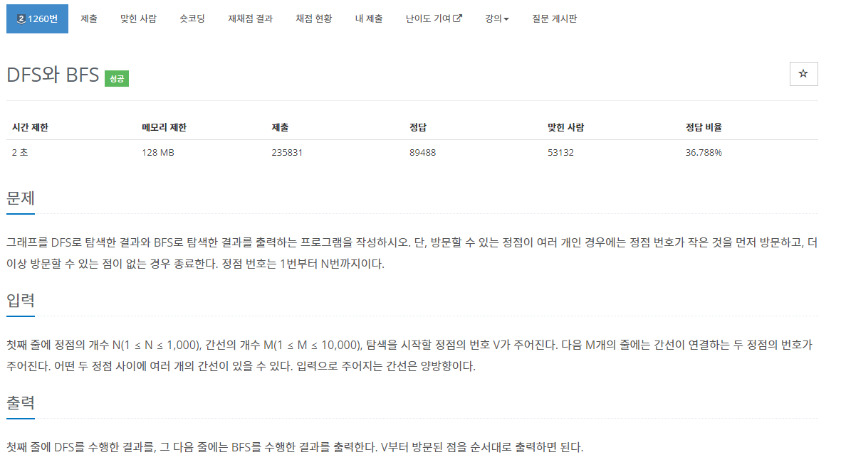 해당 문제는 DFS와 BFS의 기본개념을 이해하기 좋은문제이다. DFS는 재귀로 구현하는게 보통이고 BFS는 queue로 구현하는게 보통이다. 또한 입력받은 노드의 개수만큼 이차원 리스트로(이차원 리스