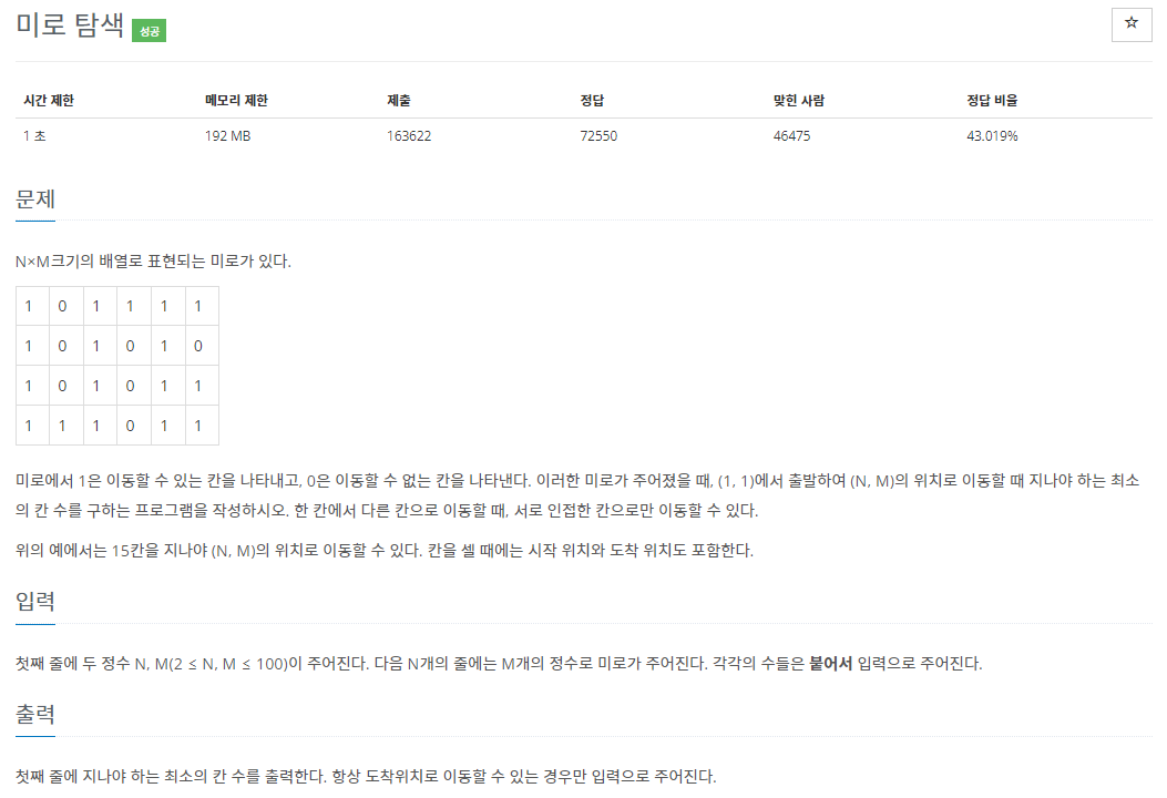 2178번: 미로 탐색 (acmicpc.net) 2178번: 미로 탐색 첫째 줄에 두 정수 N, M(2 ≤ N, M ≤ 100)이 주어진다. 다음 N개의 줄에는 M개의 정수로 미로가 주어진다. 각각의 수들은 붙어서 입력으로 주어진다. www.a
