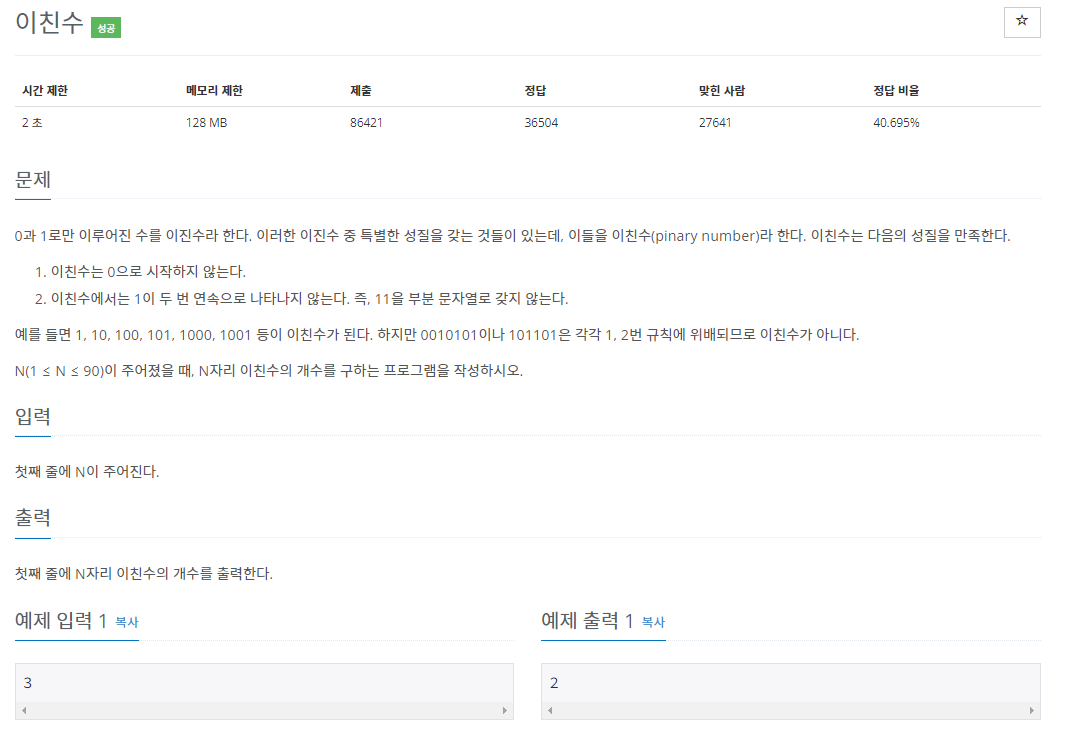 처음에 문제 이해를 잘못해서, n=1부터 입력값까지의 이진수 중에 이친 수 개수를 출력하는 건 줄 알았다.