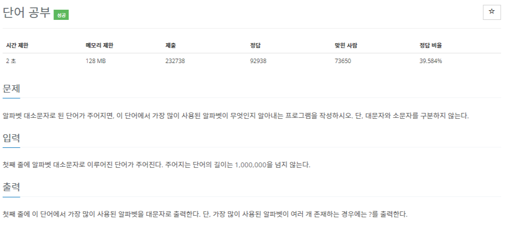 이번 포스팅은 www.acmicpc.net/problem/1157에서 푼 것을 토대로 작성했습니다. 문자열의 다섯 번째 문제인 단어 공부입니다. 문제 문제를 보고 저 나름대로 해석을 먼저 했습니다. 1. 알파벳 대소문자