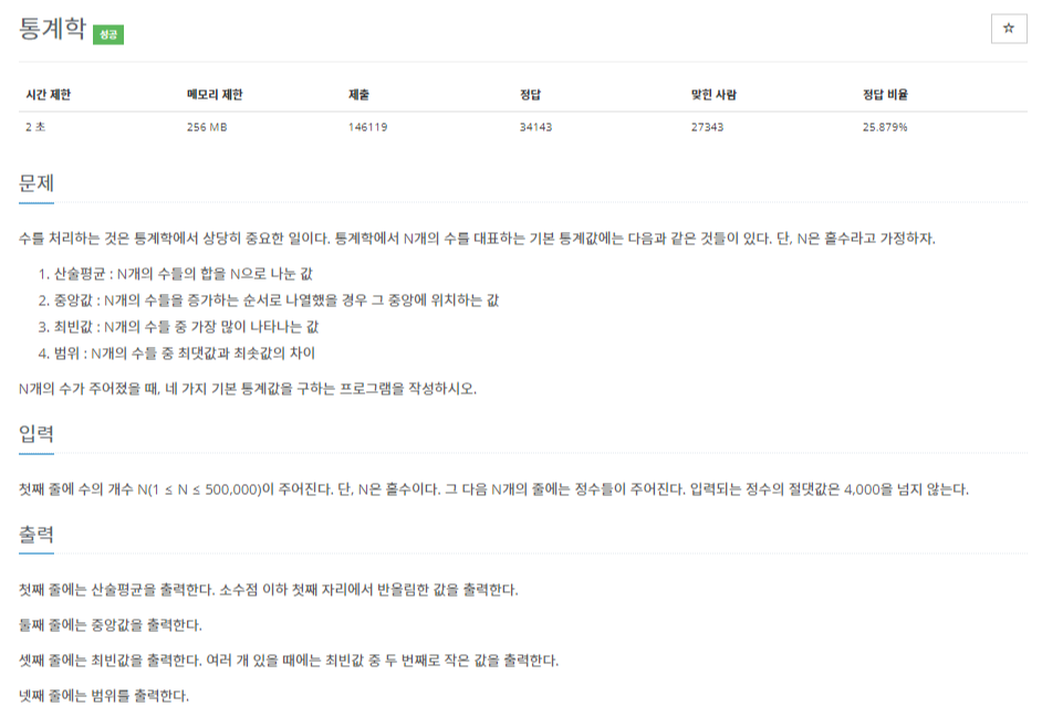 # 문제 링크 www.acmicpc.net/problem/2108 2108번: 통계학 첫째 줄에 수의 개수 N(1 ≤ N ≤ 500,000)이 주어진다. 그 다음 N개의 줄에는 정수들이 주어진다. 입력되는 정수의 절댓값은 4,000을 넘지 않는다. www.a