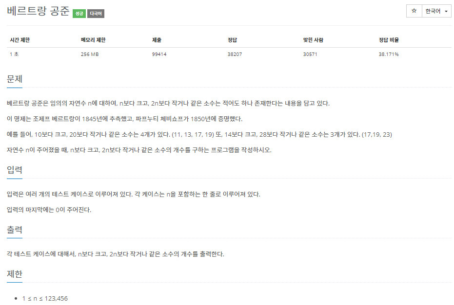 n >= 2에 대하여, 두 자연수 n < a < 2n 사이에는 적어도 한 개 이상의 소수가 존재한다.라는 정수론이다.