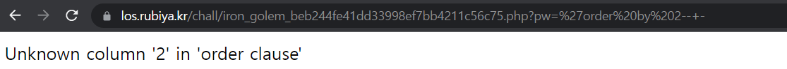컬럼의 수를 알아냈다. order by 2 에서 에러페이지가 출력되었으니 컬럼의 수는 하나이다.