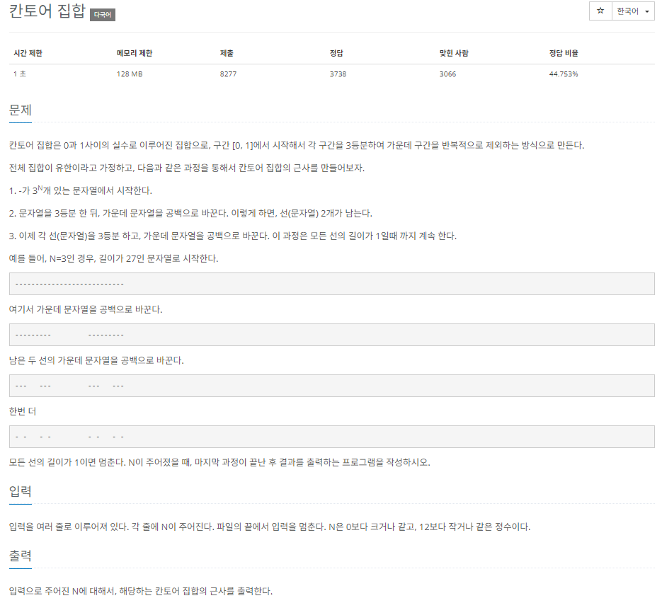 # 칸토어 집합(4779) 문제 출처 : [칸토어 집합](https://www.acmicpc.net/problem/4779) 3등분으로 분할 정복하는 문제 입니다. 주어진 길이…