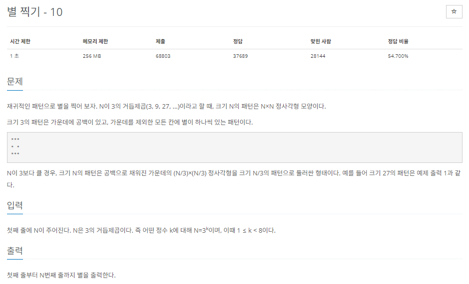 유형: 재귀함수작성일시: 11월 12일재귀적인 패턴으로 별을 찍어 보자. N이 3의 거듭제곱(3, 9, 27, ...)이라고 할 때, 크기 N의 패턴은 N×N 정사각형 모양이다.크기 3의 패턴은 가운데에 공백이 있고,