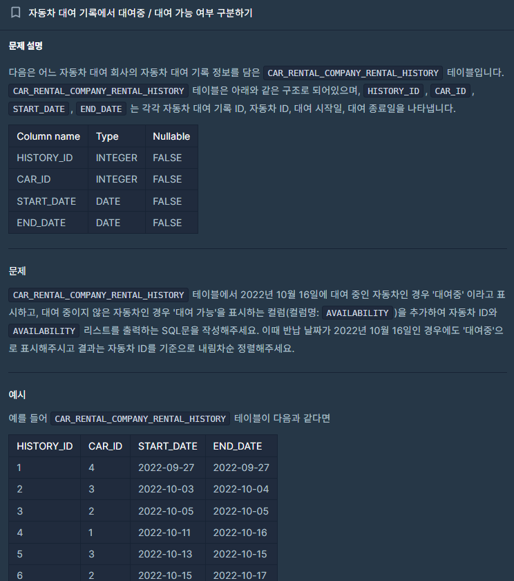 [프로그래머스 | SQL] 자동차 대여 기록에서 대여중 / 대여 가능 여부 구분하기