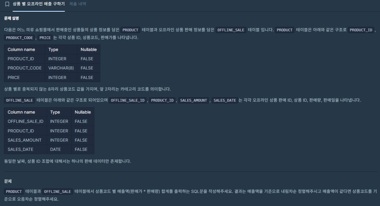 - OFFLINE_SALE 테이블에서 PRODUCT_ID별로 팔린 개수를 구한다.