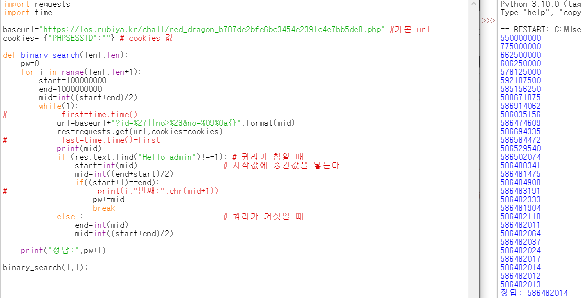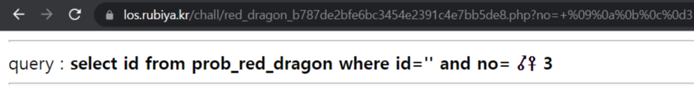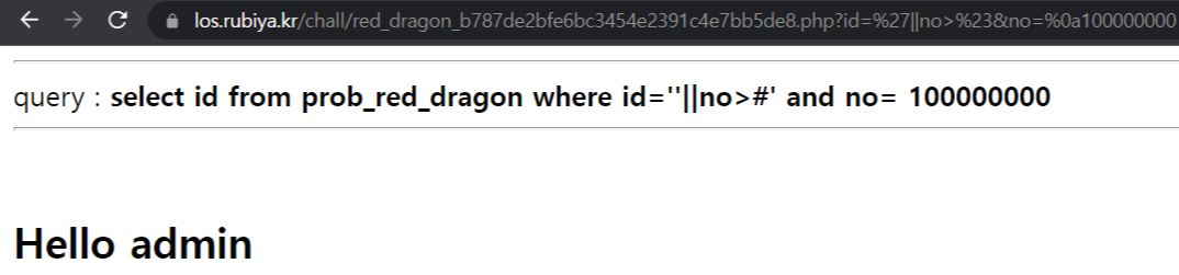 id는 7글자 이하로 작성해야 하니? id='||no>%23&no=%0a1 // 주석처리를 통하여 and no=' 부분을 주석 처리하고 no의 첫 번째에 줄 바꿈 문자(%0a)를 삽입하여 no값을 유효시켜준다.