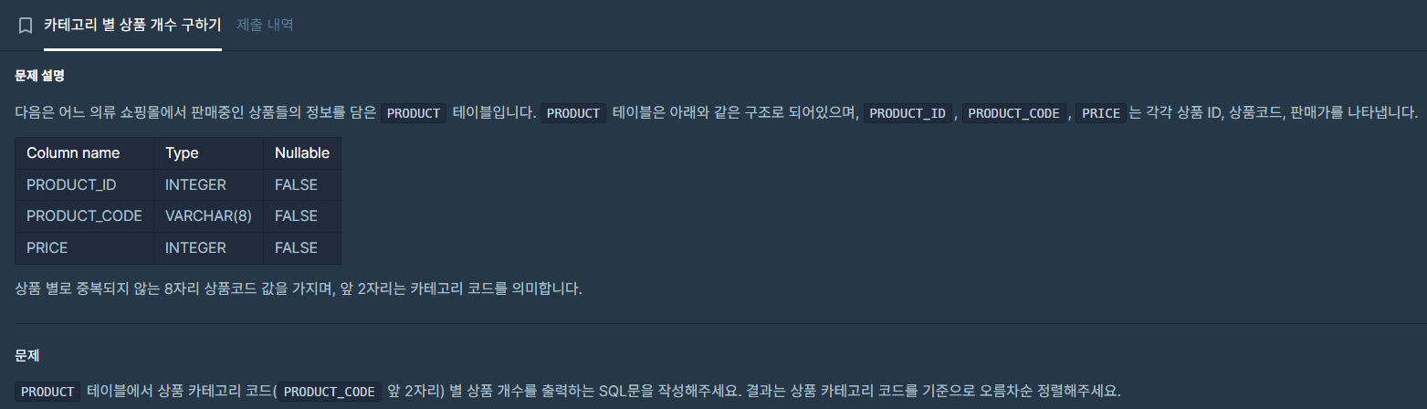 SELECT SUBSTR(PRODUCT_CODE,0,2) CATEGORY, COUNT(SUBSTR(PRODUCT_CODE,0,2)) PRODUCTS