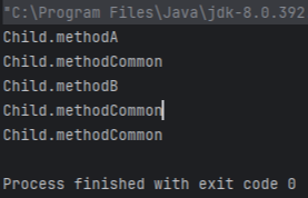 하지만 Interface의 모든 메서드는 반드시 오버라이딩 되어야만 하고, 오버라이딩 된 경우에는 실행 우선권을 갖기 때문에 객체 타입이 interfaceA 여도 우선권을 가진 Child Class의 methodA가 정상적으로 참조되어 실행된 것을 볼 수 있다.