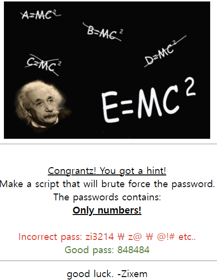 비밀번호를 브루트 포스로 크랙하라고 힌트를 알려주고 있고, 비밀번호는 숫자로만 이루어져있다.