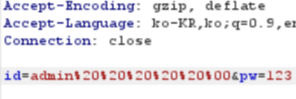 1. burp suite로 값을 전달할 때 공백은 url인코딩 후 전달해야 정상적으로 전달된다.