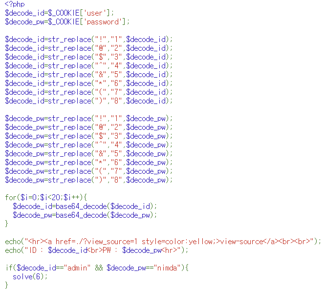 두 번째 코드는 cookie값으로 받은 id와 pw의 특수문자를 특정 수로 치환하며 20번 base64로 디코딩해준다.