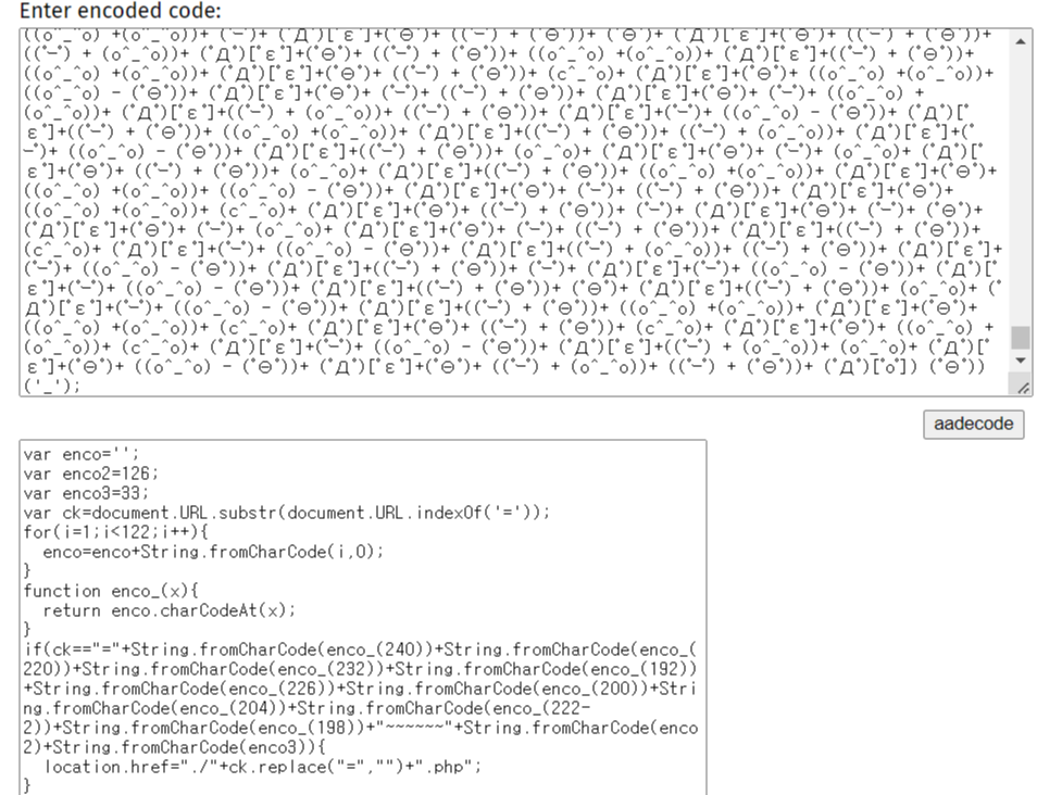 aaencode 디코더 : https://cat-in-136.github.io/2010/12/aadecode-decode-encoded-as-aaencode.html