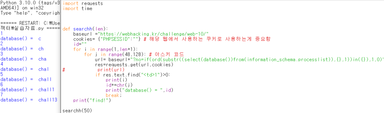 실수로 database()의 길이을 먼저 추출하지 않았지만, 7자리에서 더 진전이 없기에 database()의 값은 'chall13'이다.