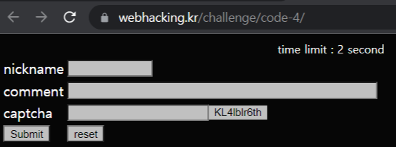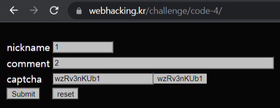 nickname, comment, capcha 텍스트 입력 부분과 10개의 랜덤 한 문자열, submit과 reset 버튼이 있다.
