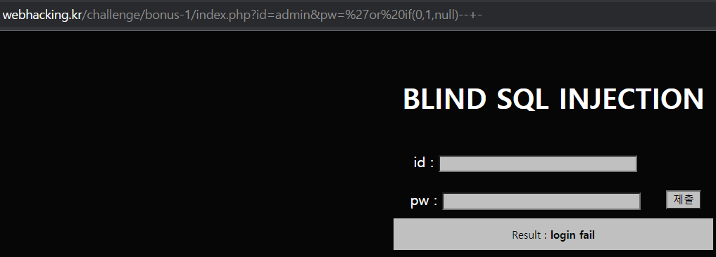 쿼리 : ?id=admin&pw='or if(0,1,null)--+-