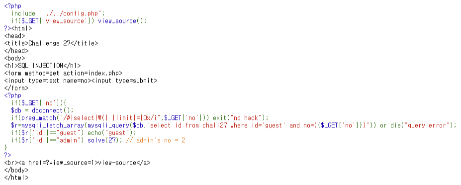 또한 쿼리문은 select id from chall27 where id= -'guest' ~~ 로 id값이 guest로 고정되어있다.